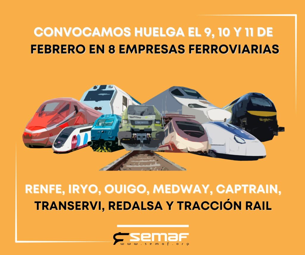 SEMAF culmina los trámites reglamentarios para llevar a cabo una huelga general en el sector ferroviario los días 9, 10 y 11 de febrero, que involucrará, por parte de esta organización, a las ocho principales empresas ferroviarias que aportan tracción y en las que cuenta con la representación legal requerida para convocarla. (más…)